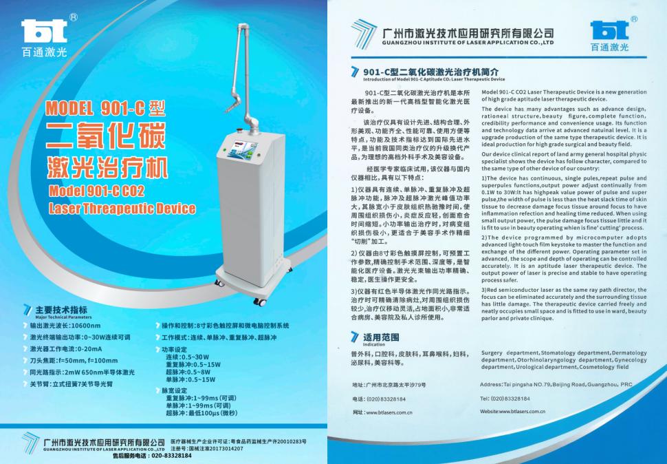本治疗机为全封离内腔式连续波二氧化碳激光器的激光治疗机。二氧化碳激光的波长为10600nm,这种波长特别容易被人体组织吸收,故利用二氧化碳激光的热效应能有效地对人体组织汽化、碳化、凝固和照射,达到手术治疗的目的。